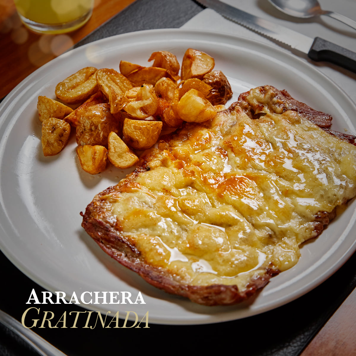 250 gr. Marinada gratinada con queso Gouda Uruguayo acompañado de papas a la francesa.