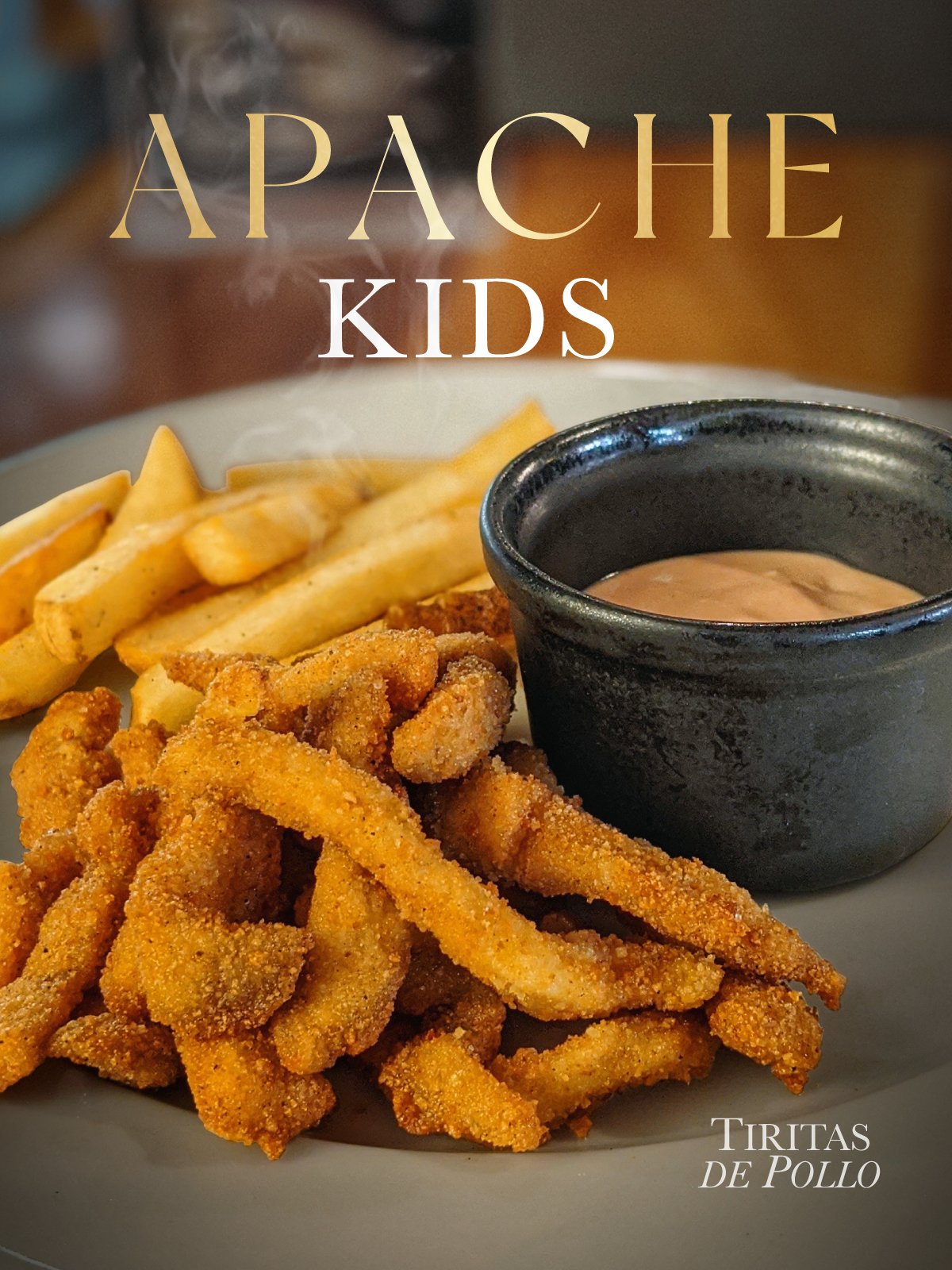 Fajitas de pechuga de pollo, puede ser asadas o empanizadas, acompañadas de papas a la francesa. Incluye sopa, bebida y postre.