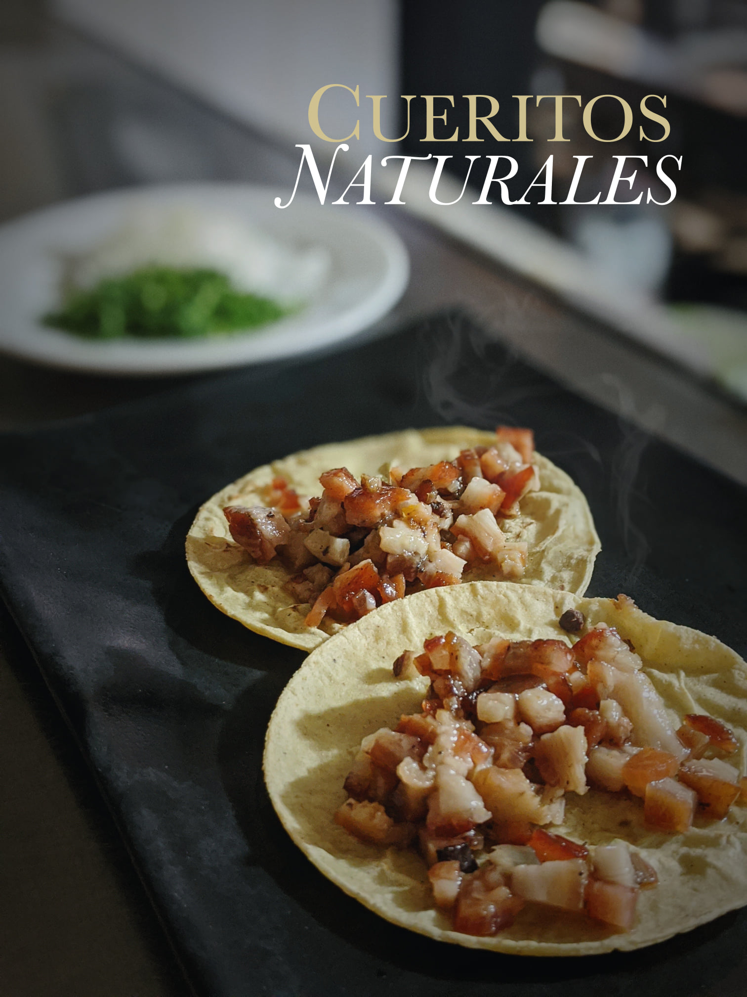 150 gr.Son 5 tacos de jugosos Cueritos de Chamorro, acompañados de rajas de chile jalapeño y cebolla.