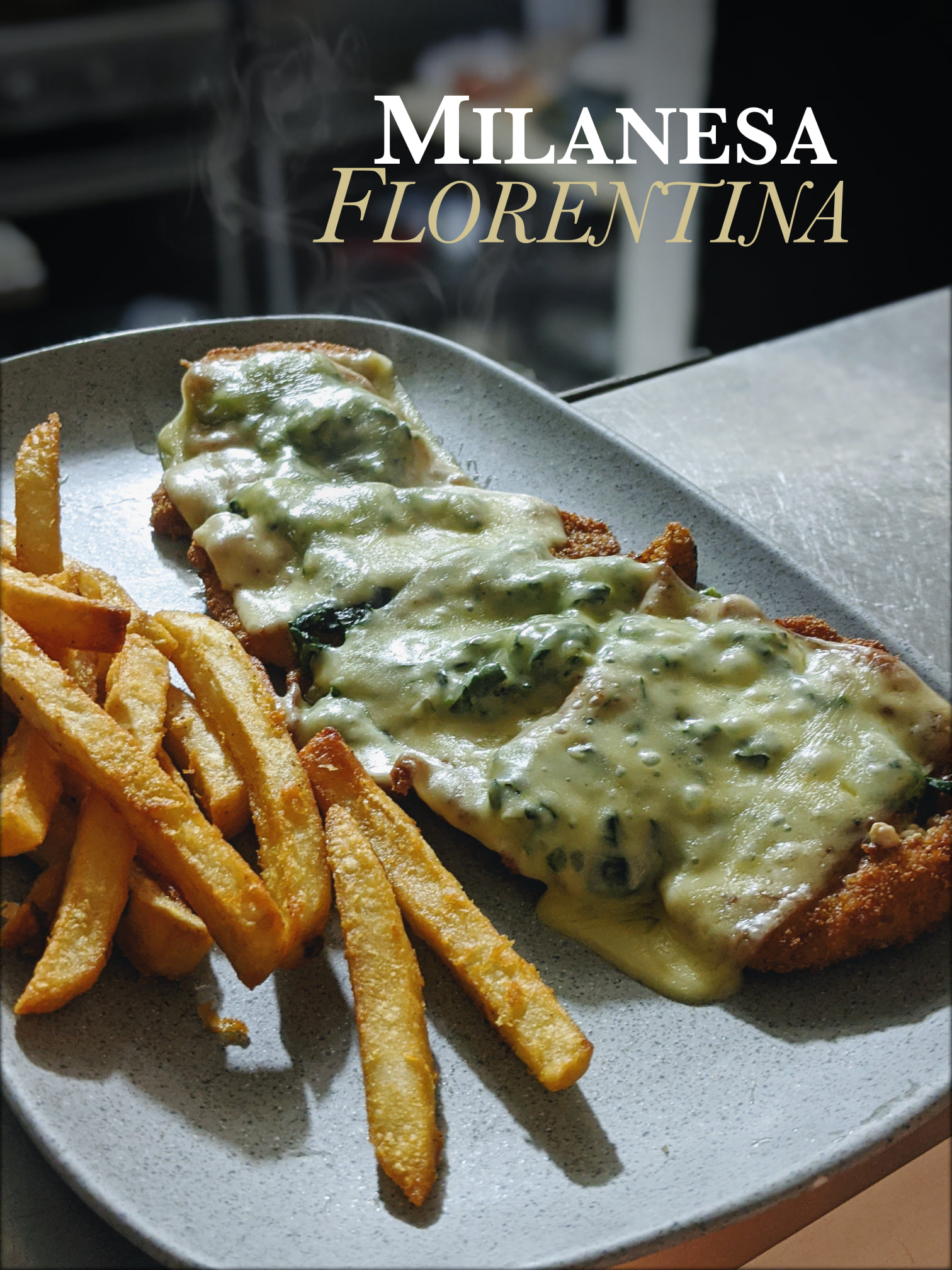 250 gr. Marinada , bañada en espinacas a la crema y gratinada con queso Gouda Uruguayo, acompañado de papas a la francesa.