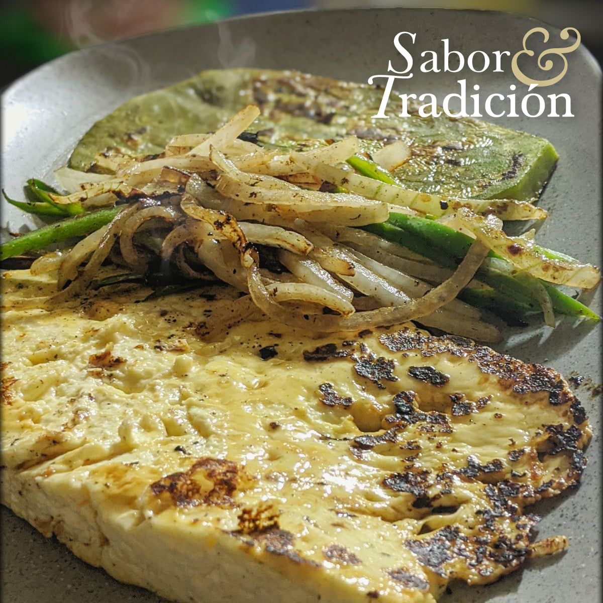 200 gr. Queso panela originario de La Joya, acompañado de nopal, cebolla y chiles asados con un toque de la casa