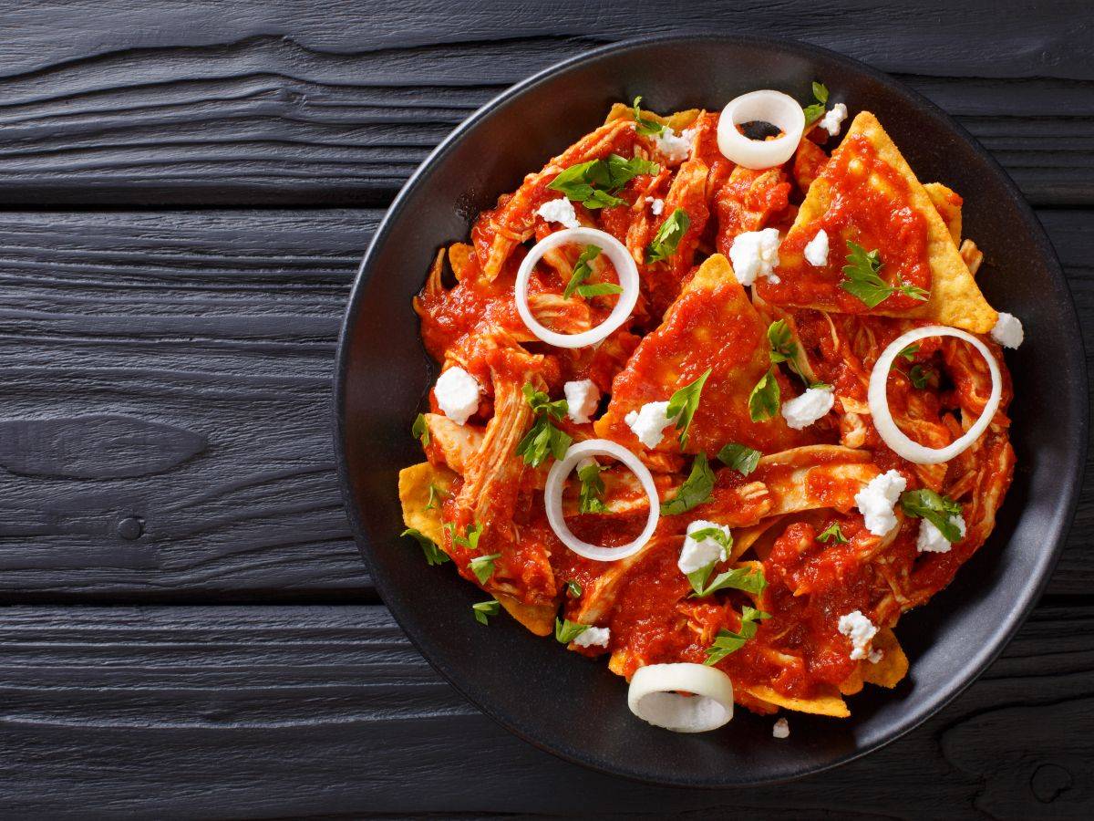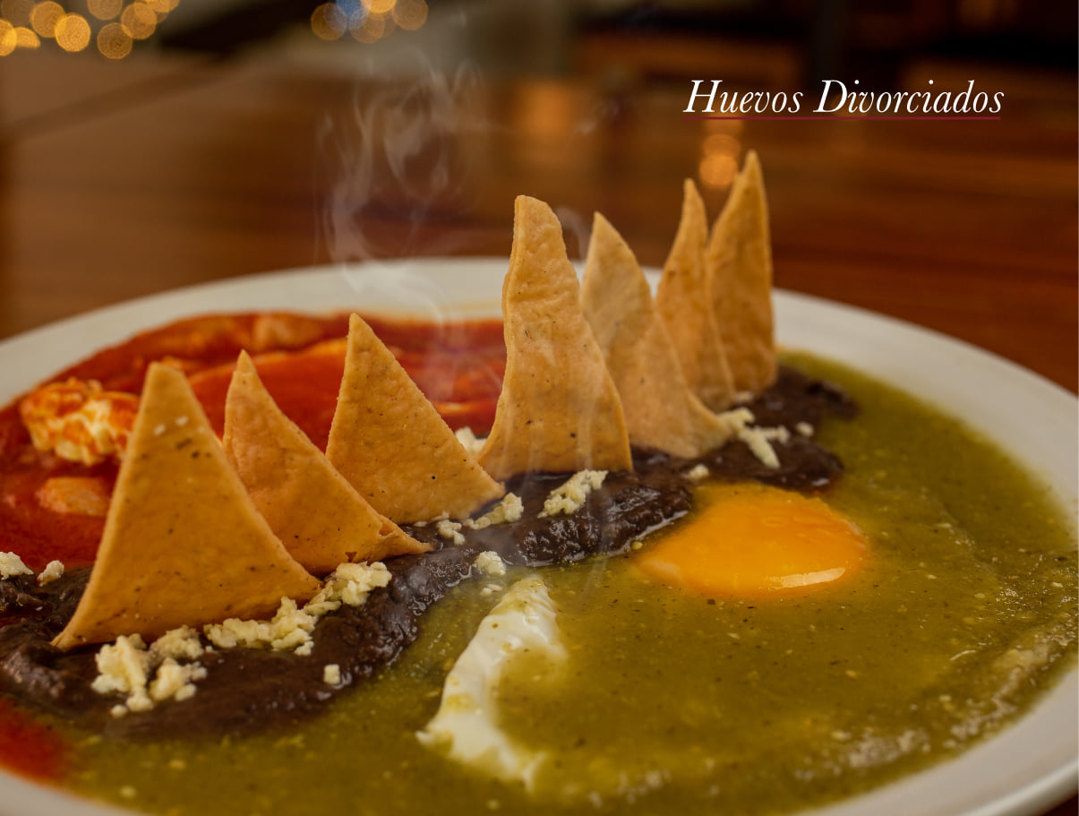 Chilaquiles rojos o verdes rellenos de pollo o huevo + ¿Jugo o Fruta?*1