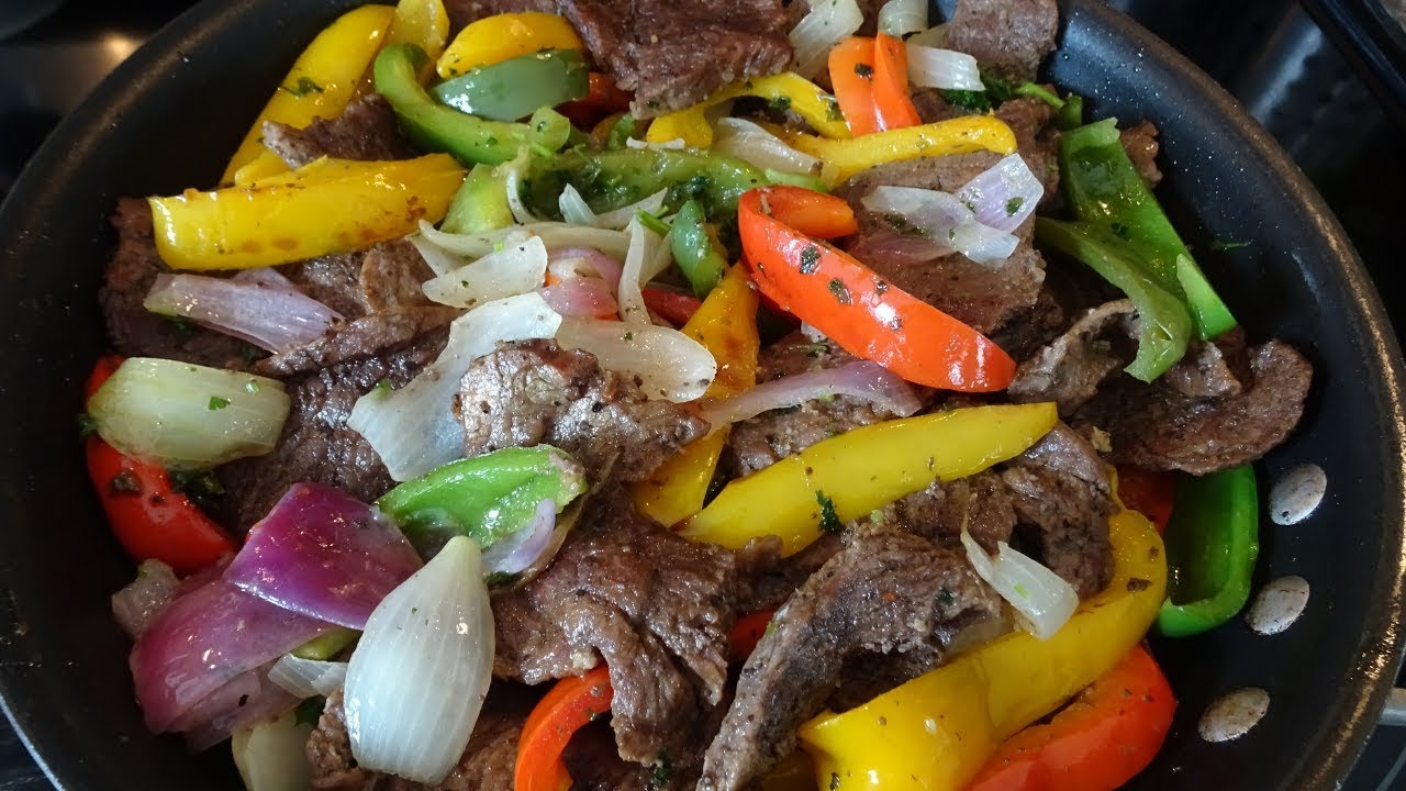 Fajitas de cecina salteada con cebolla morada, pimiento y chile poblano acompañado de queso panela y frijoles refritos(150 gr.)*1 + ¿Jugo o Fruta?*1