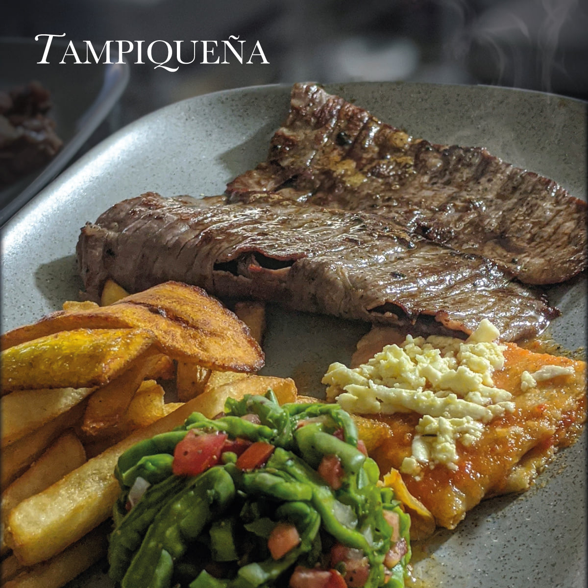 180 gr. A la plancha acompañada de frijoles refritos, platano frito, papas a la francesa, una enchilada roja y ensalada de verduras.