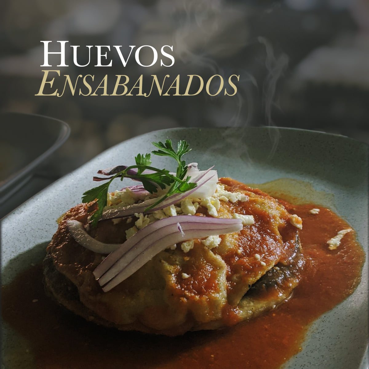 Relleno de queso gouda con rajas de chile poblano y granos de elote, servido sobre un espejo de crema de chile poblano
