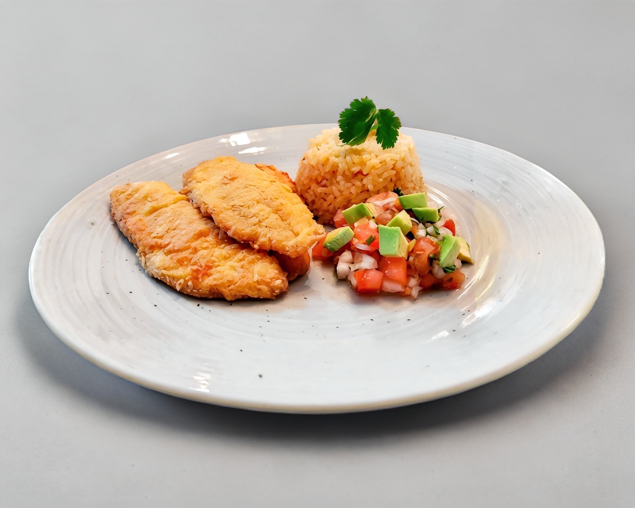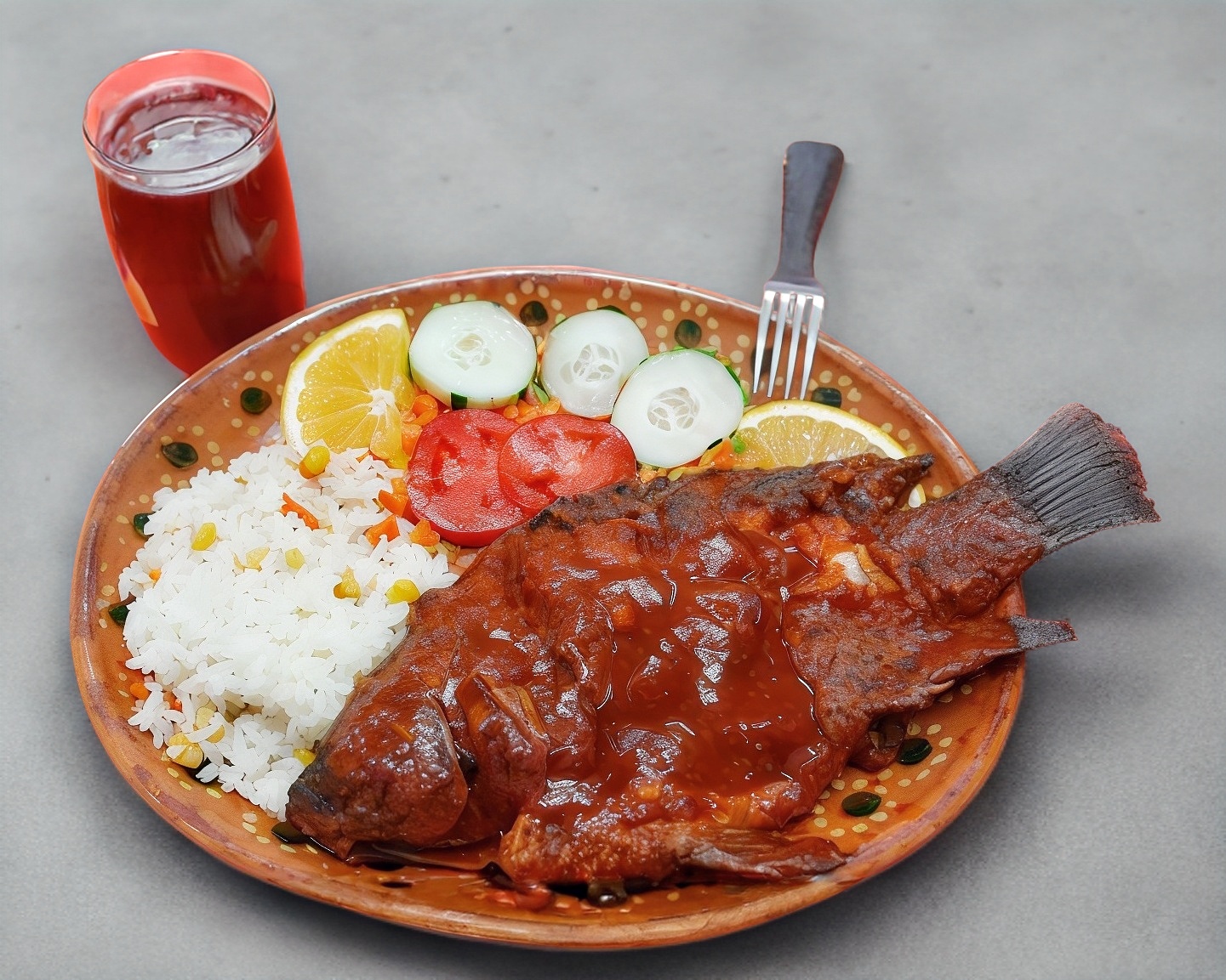 Deliciosa mojarra frita, acompañada de arroz y ensalada.