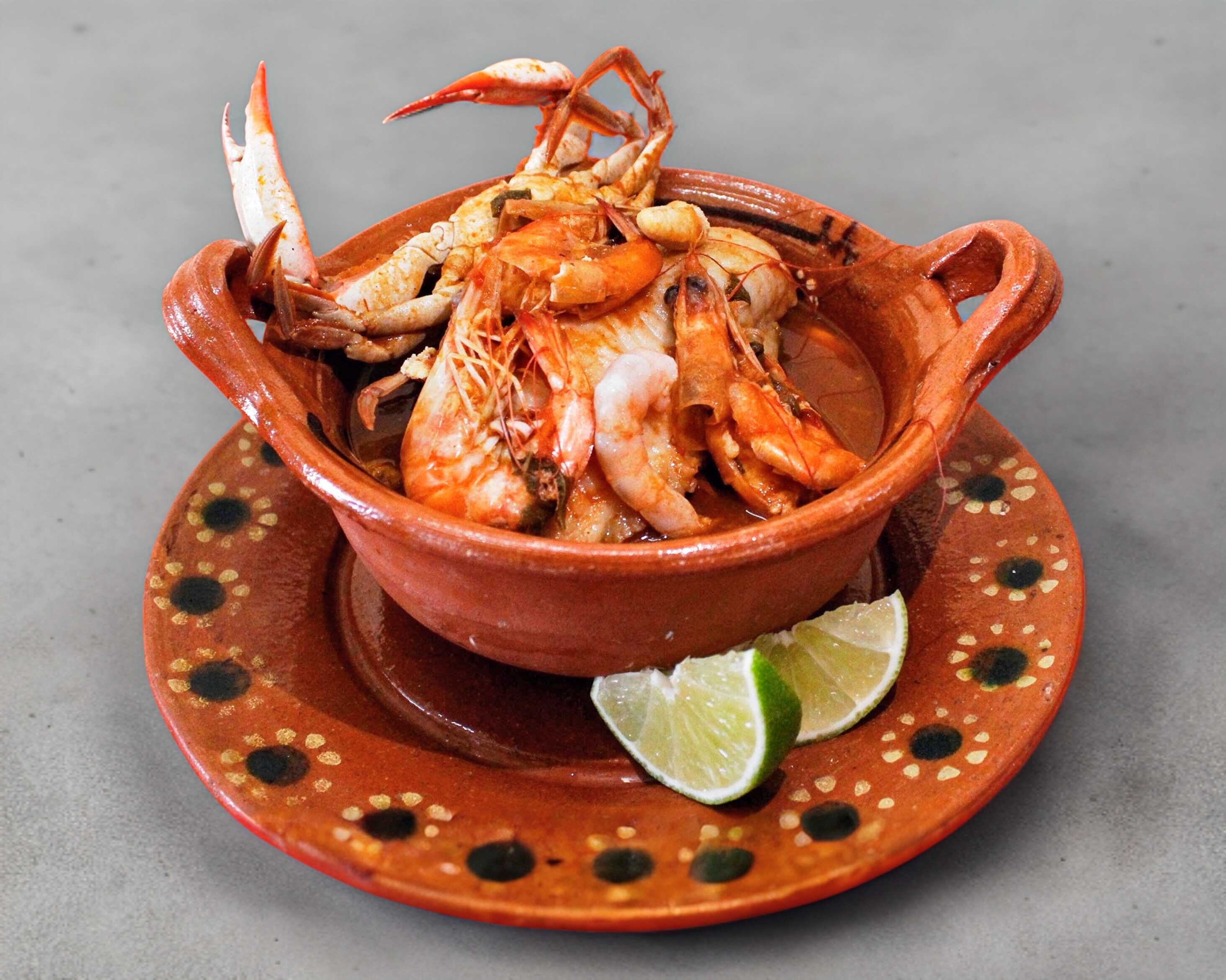 Esta cazuela contiene los siguientes mariscos: camarón, caracol, hueva, pulpo, camarón en cáscara , jaiba en concha.