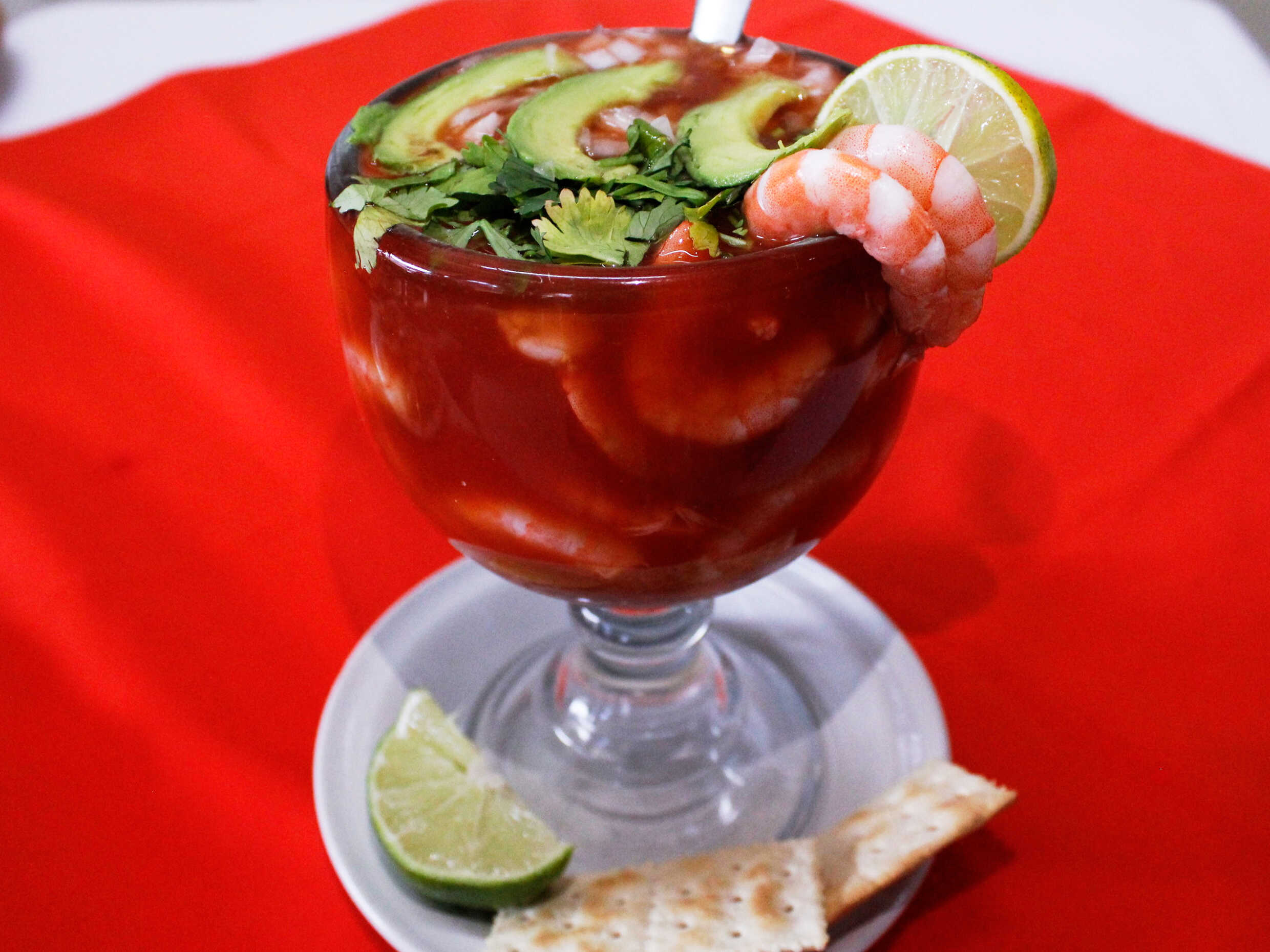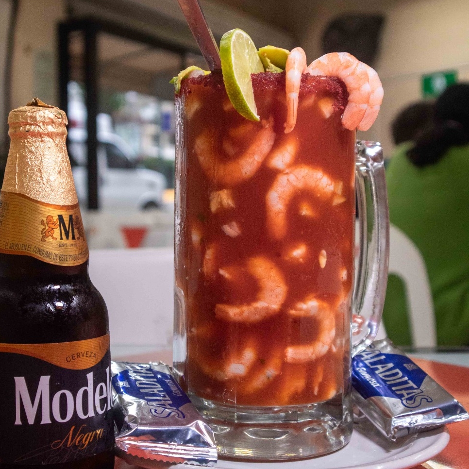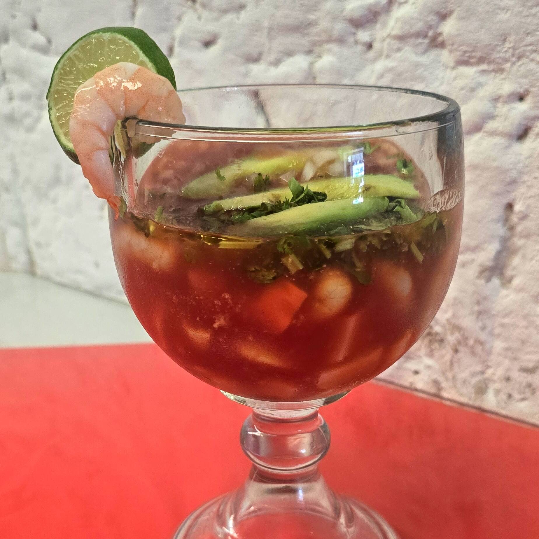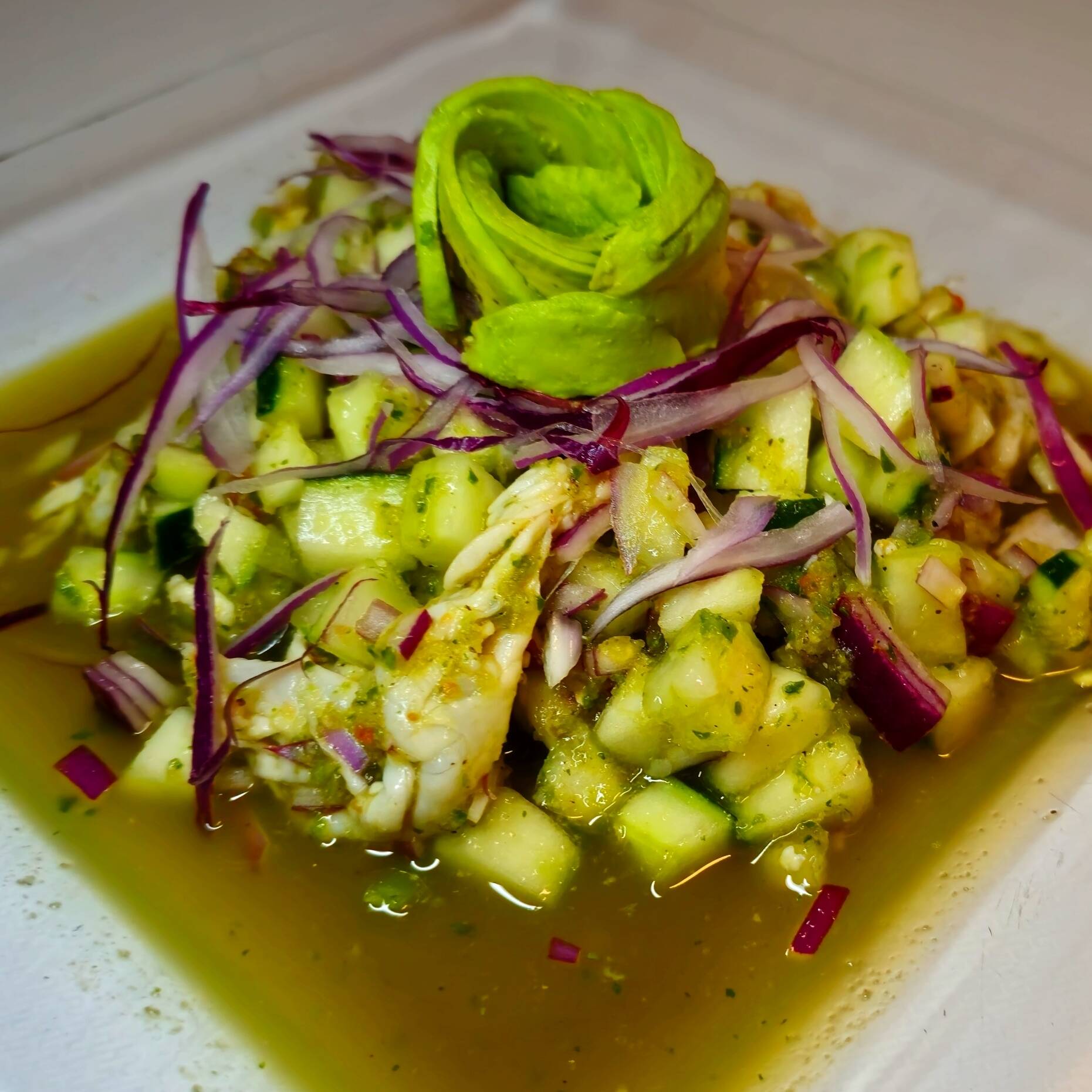 Para los amantes del picante, camarón fresco macerado en jugo de limones con habanero, pepinos y cebolla morada.