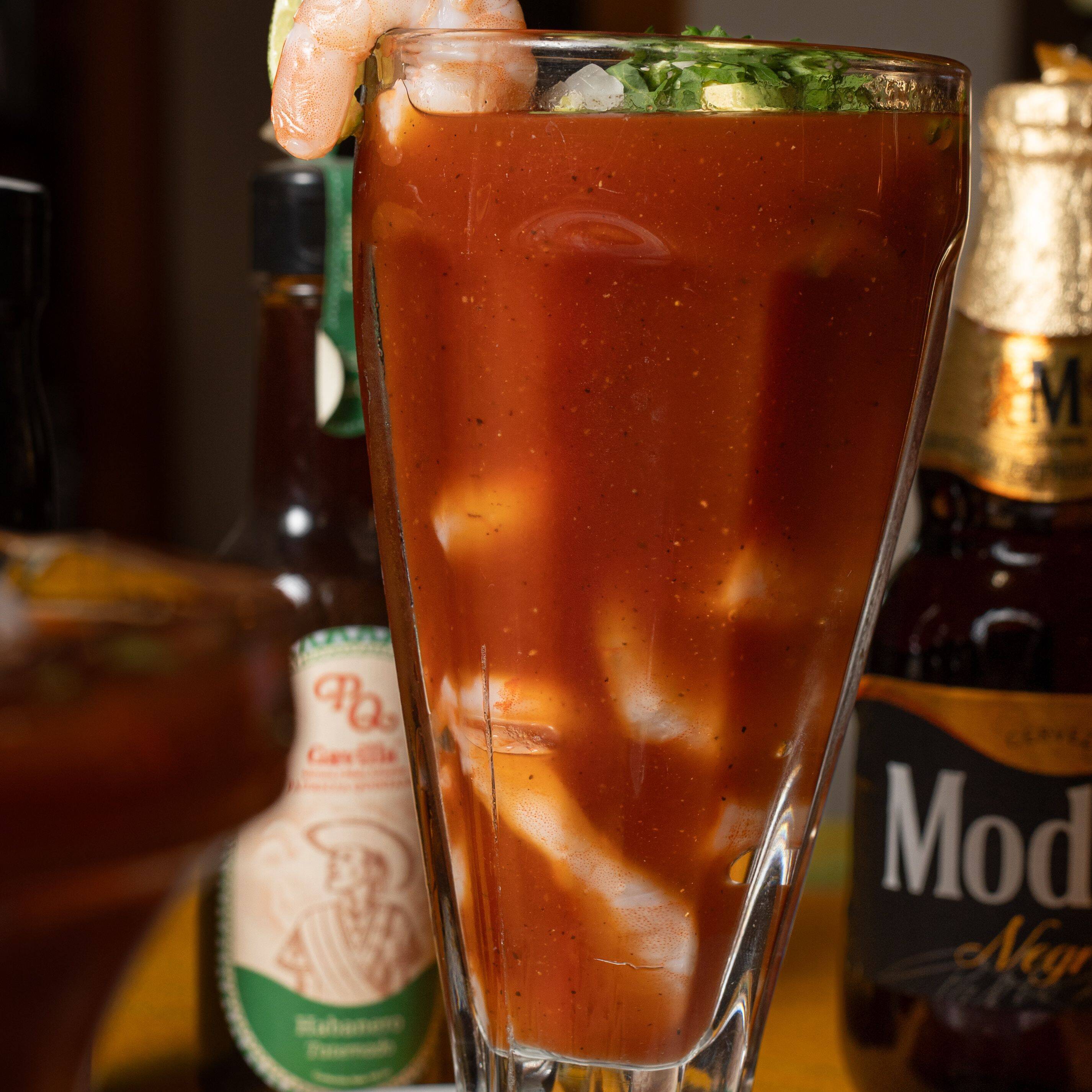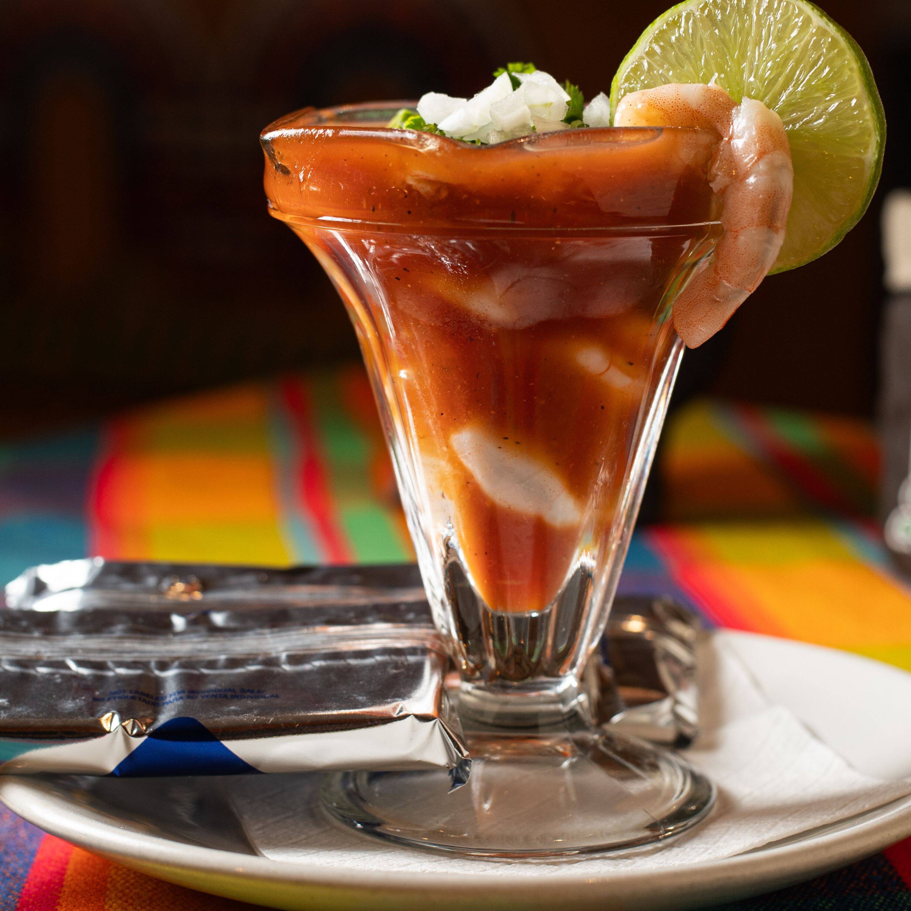 Pulpa de camarón pre cosido bañado en salsa de tomate acompañado de cilantro cebolla y galletas saladas