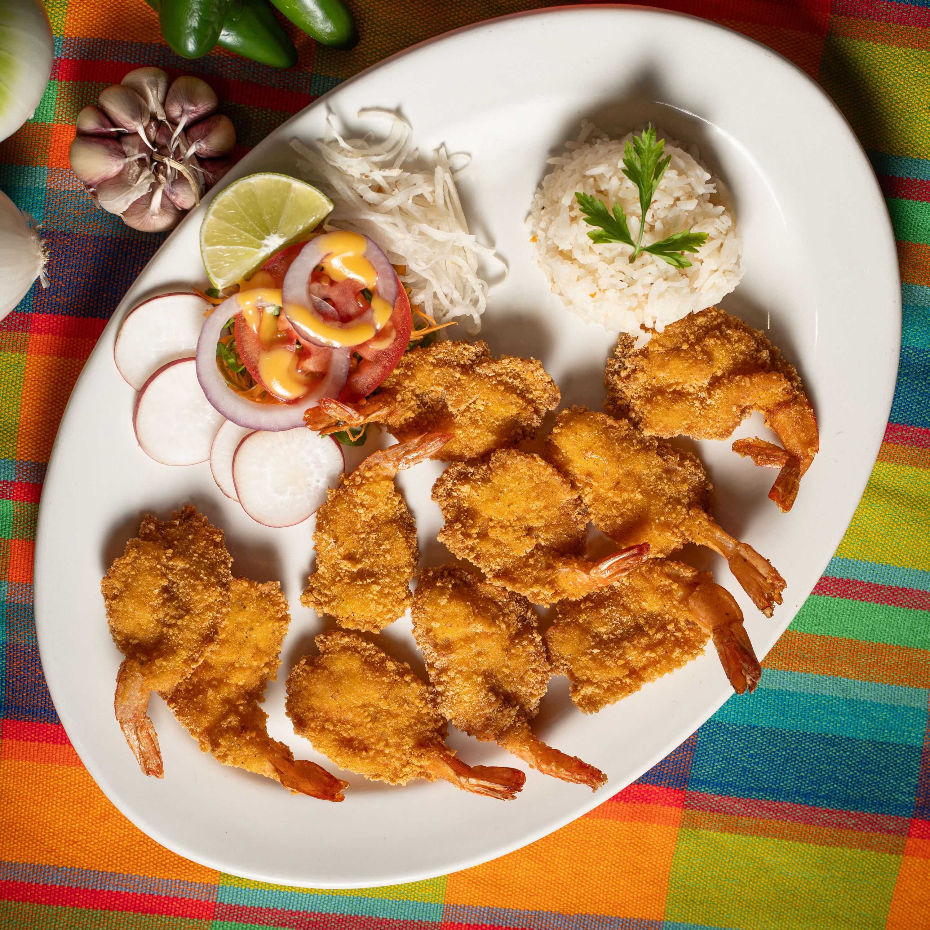 Camarónes frescos empanizados acompañandos de arroz, con ensalada