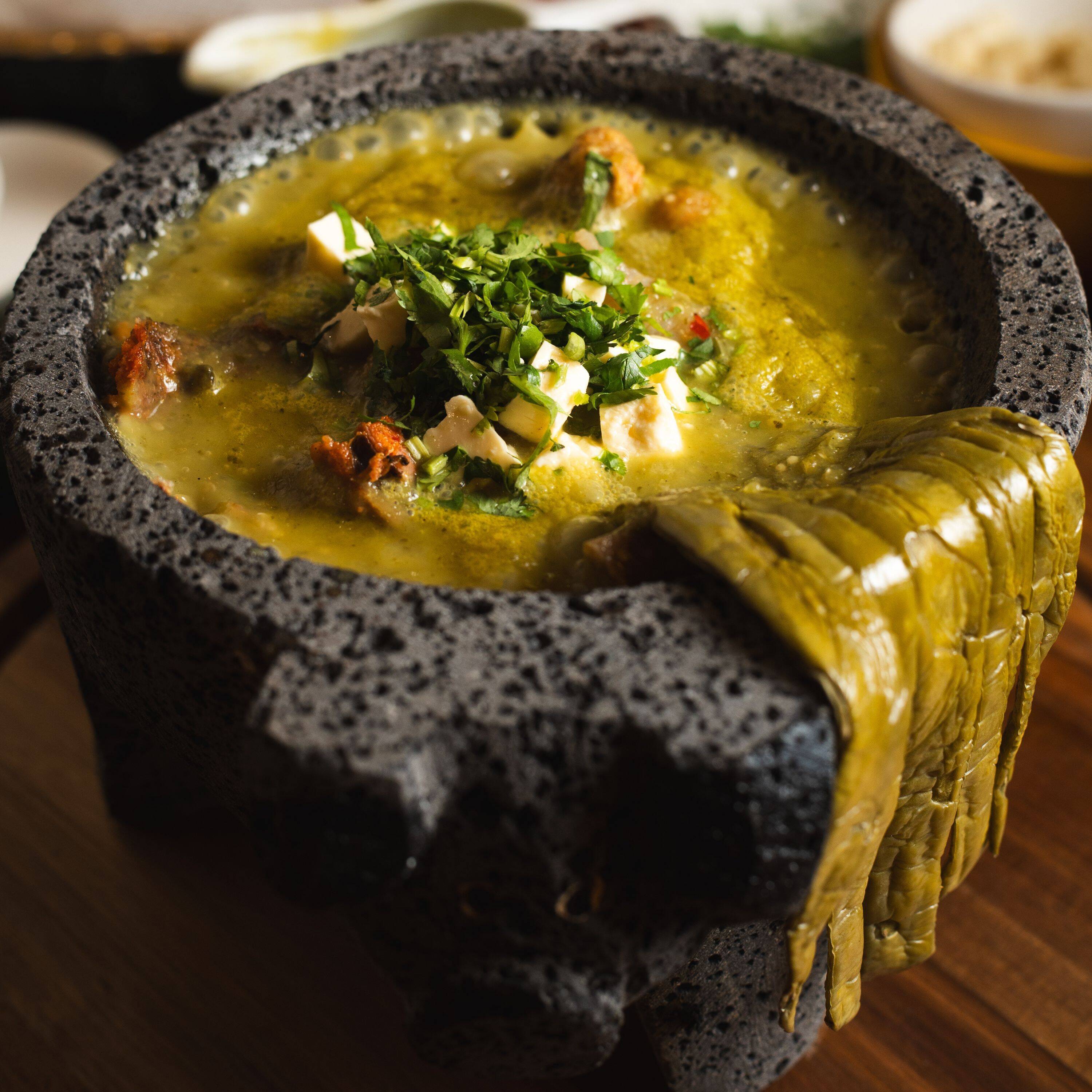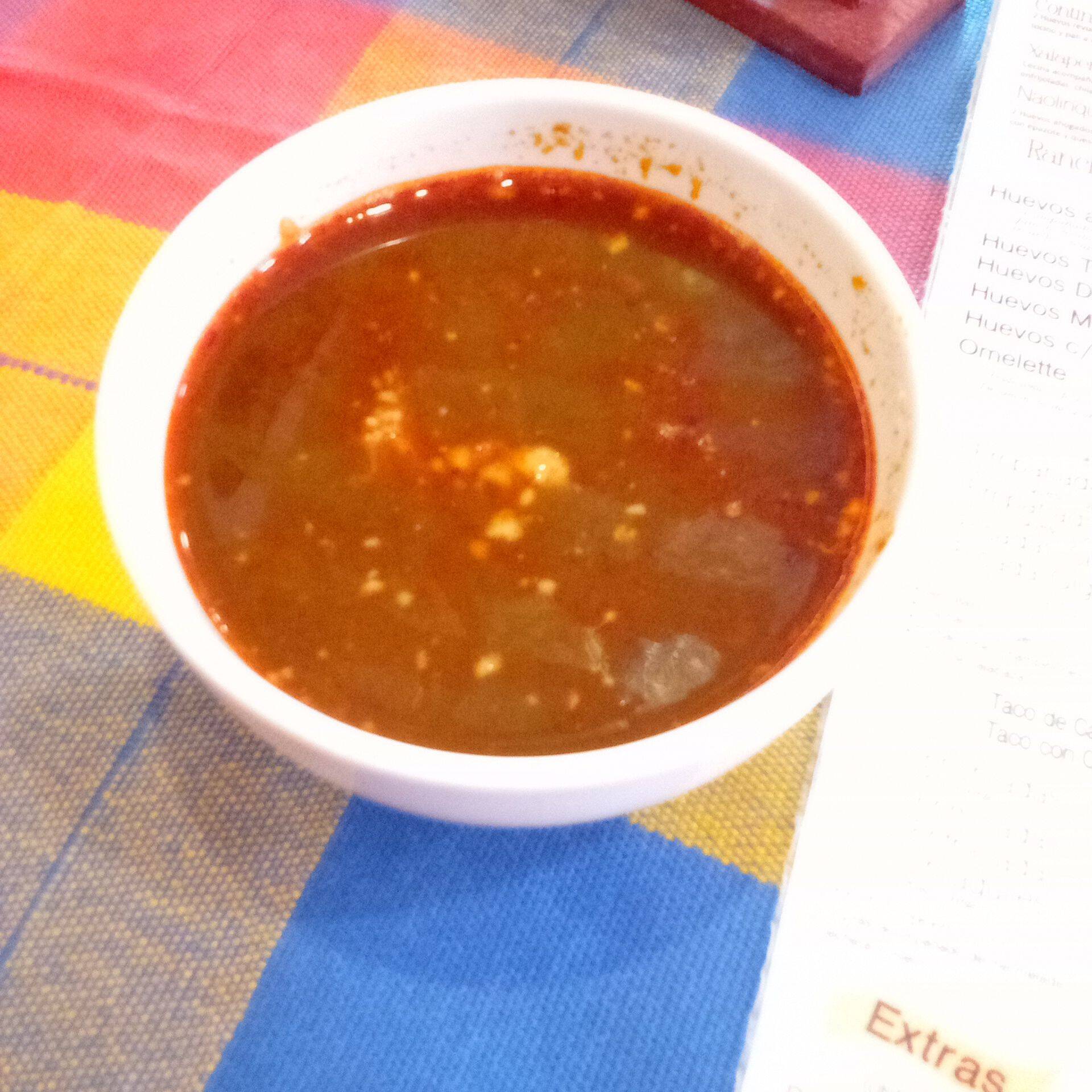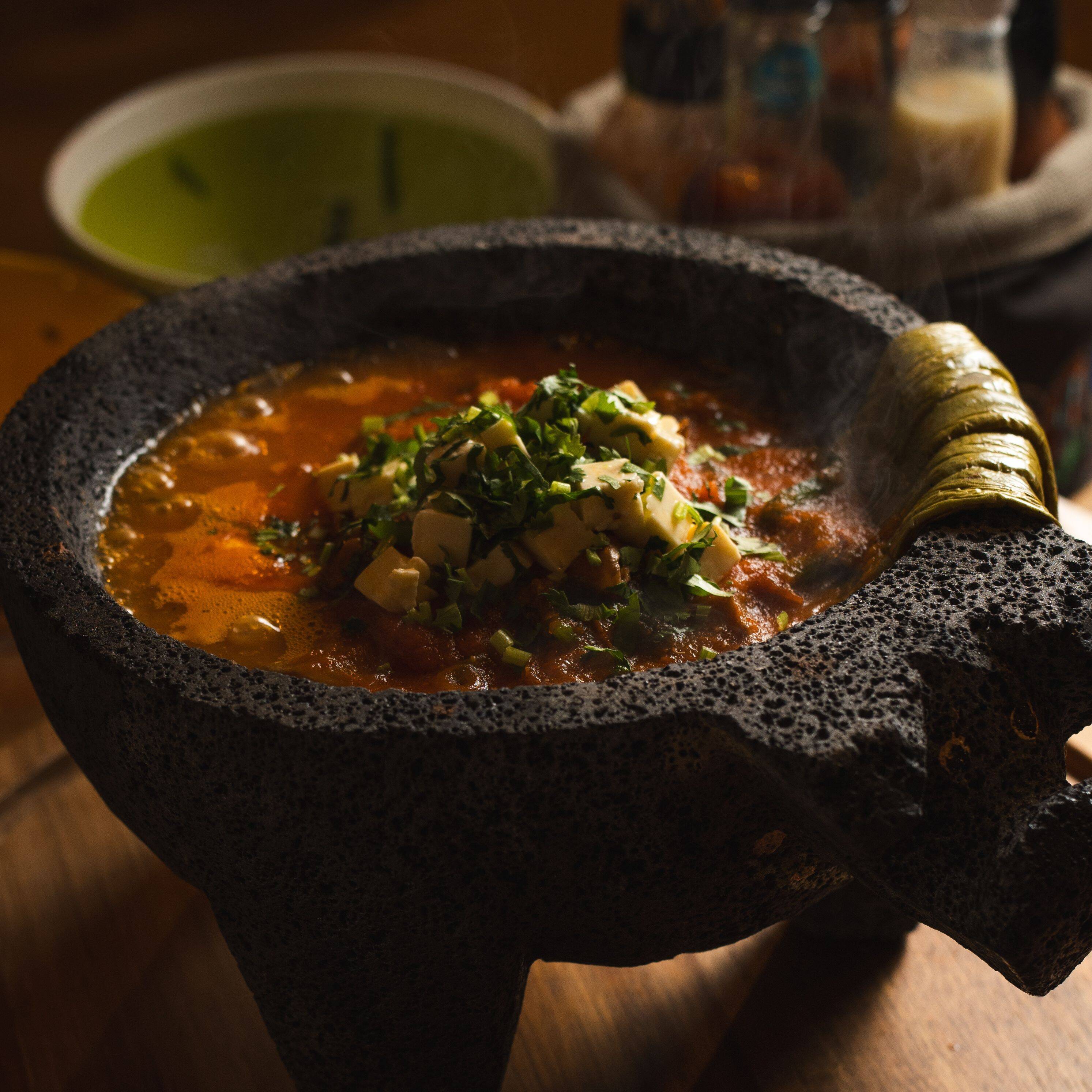 Camarónes pelados cocidos en un caldo, a base tomate y chile de árbol con un sutil toque de epazote acompañado de tortillas