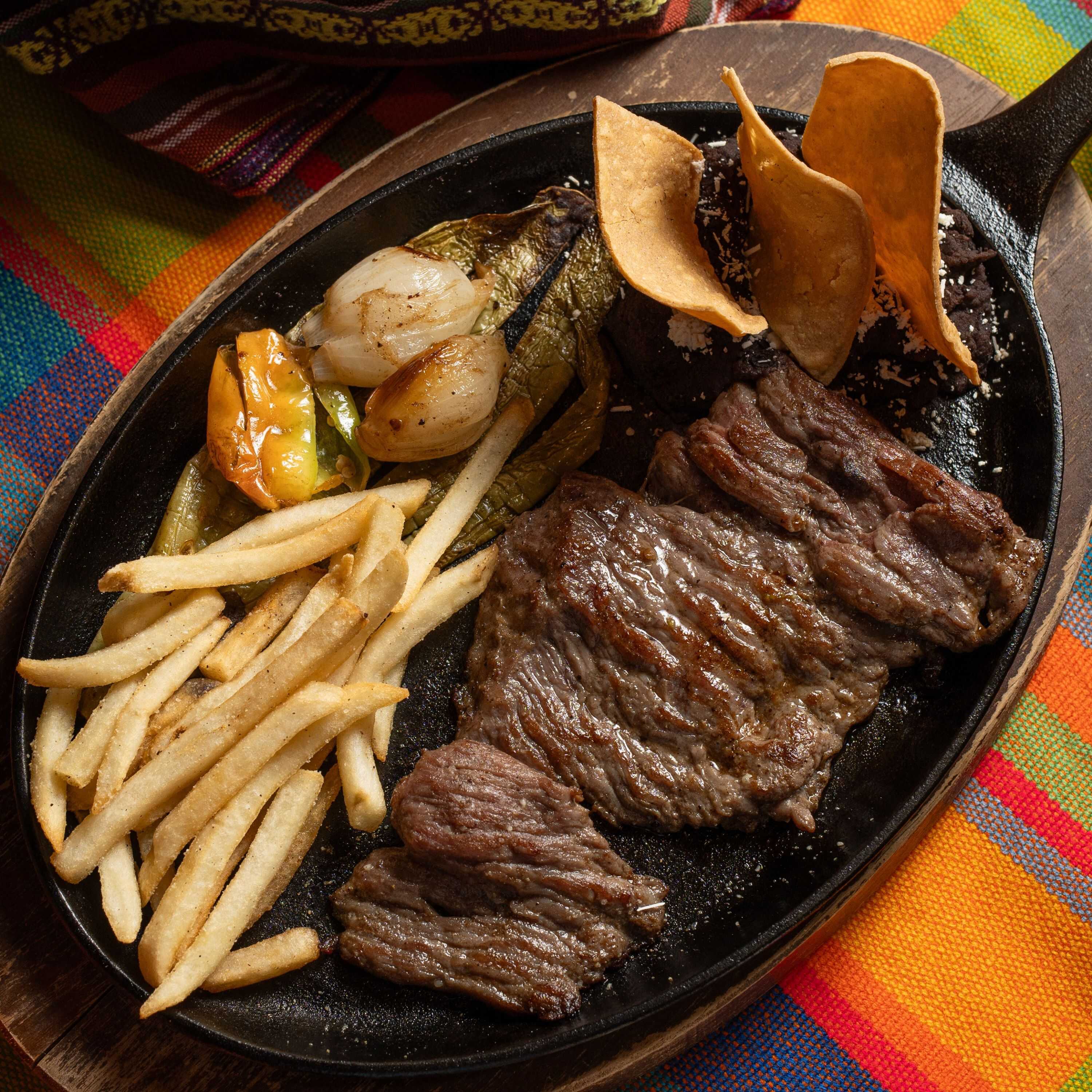Carné Angus fresca acompañada de cebollinas papas a la francesa, chiles toreados,nopal y frijoles refritos