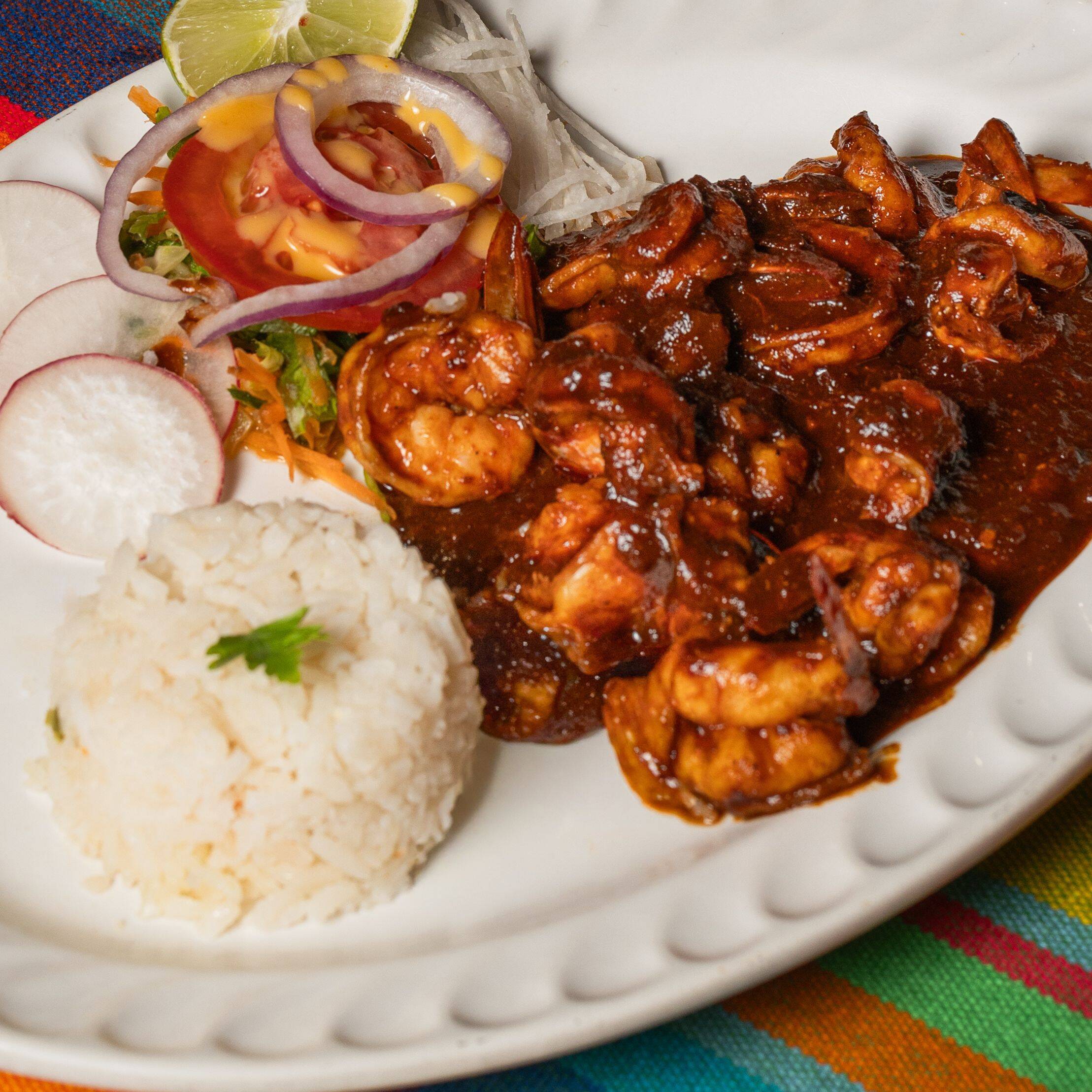 Camarónes sin cáscara sazonado en salsa de chipotle acompañado de ensalada y arroz blancos