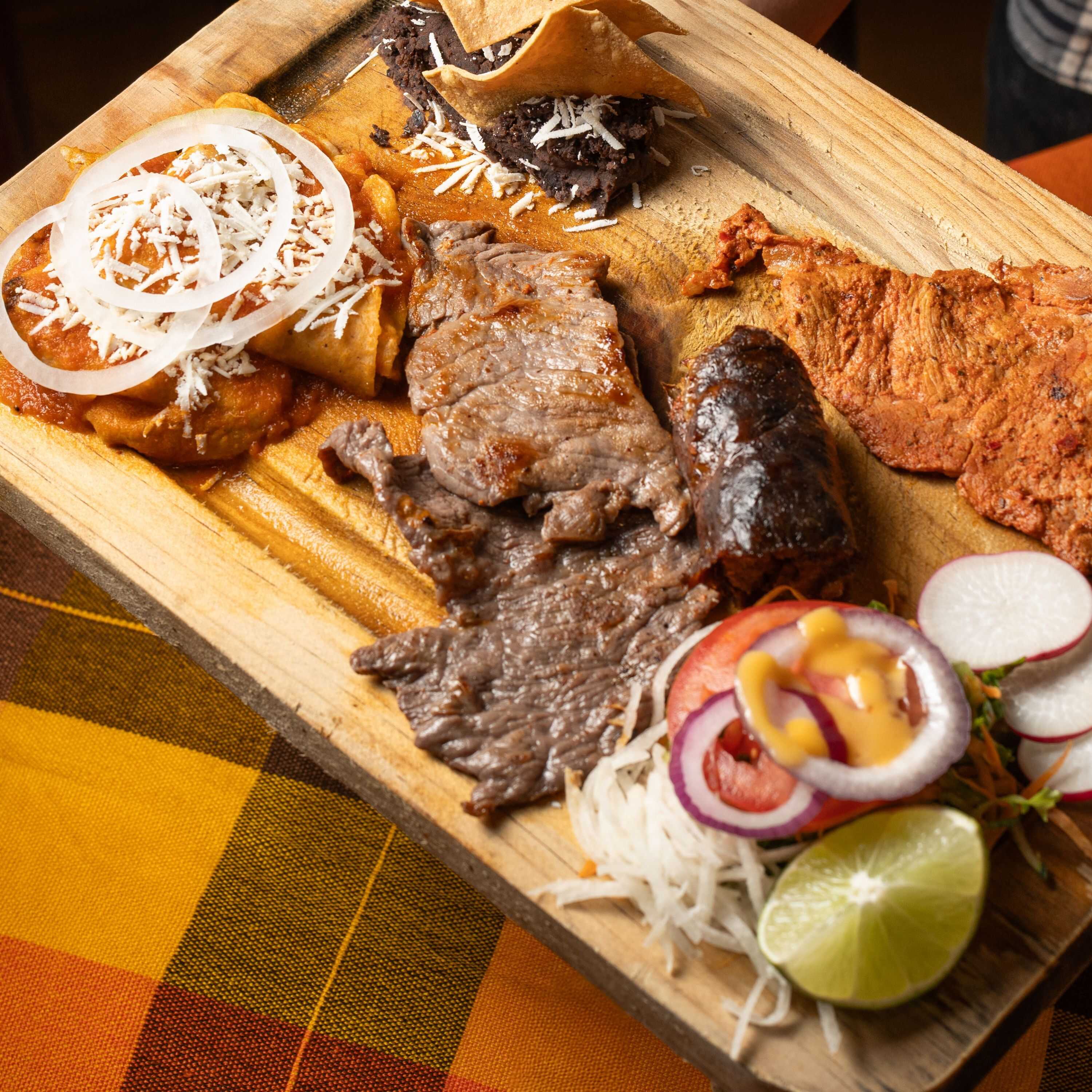 Carne salada, carne enchilada, longaniza, 2pz de enchiladas frijoles refritos y ensalada