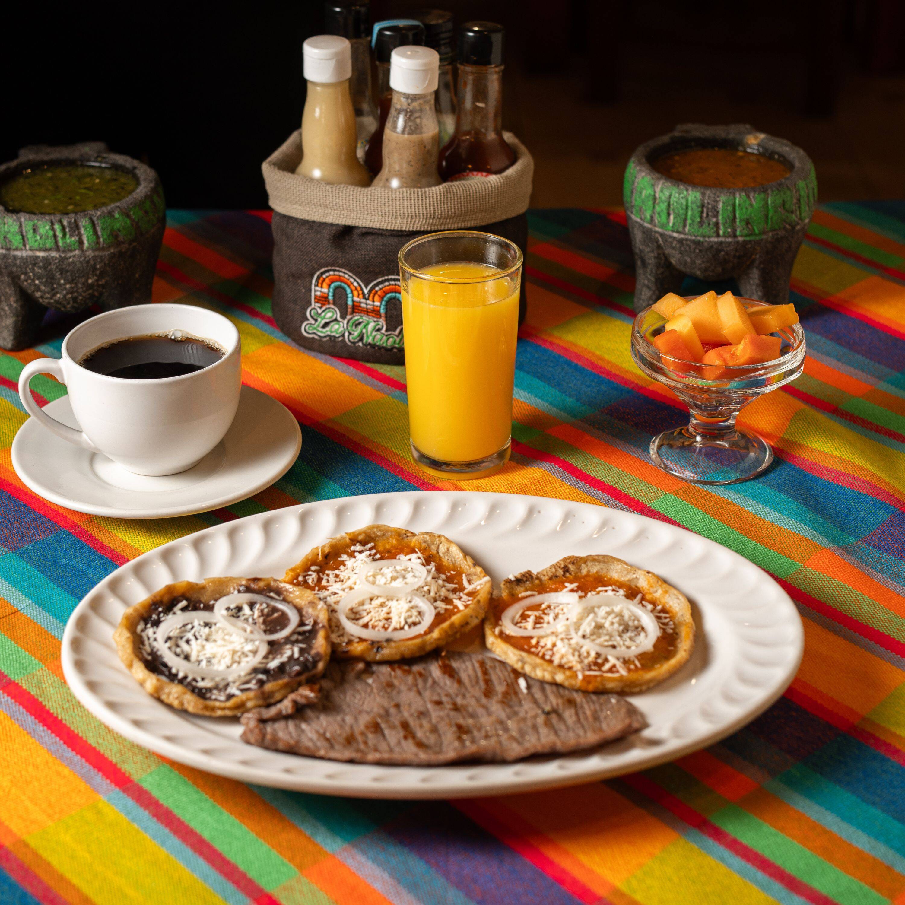 Huarache de frijol con cecina y queso de hebra acompañado de café americano, jugo de naranja y fruta