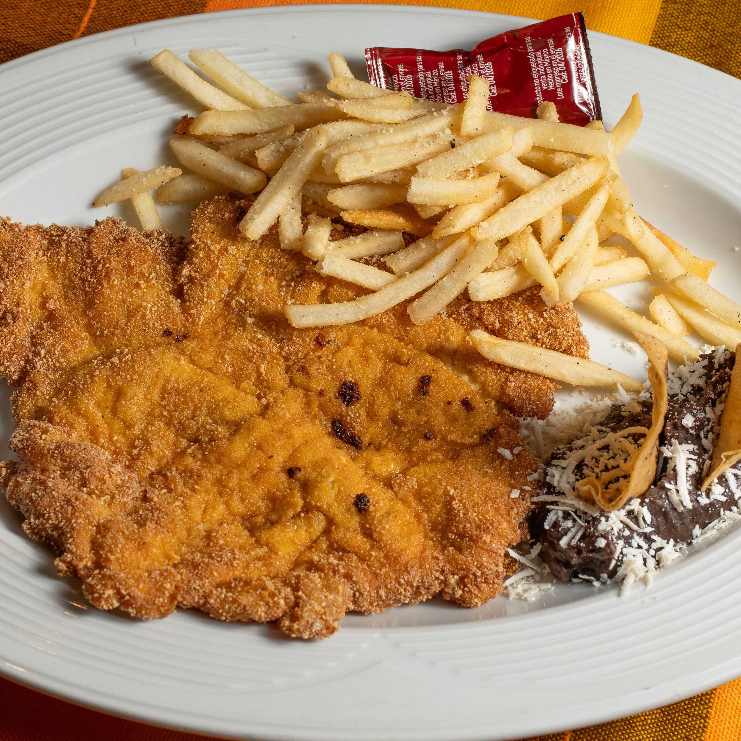 Pollo fresco acompañado de papas a la francesa y frijoles refritos