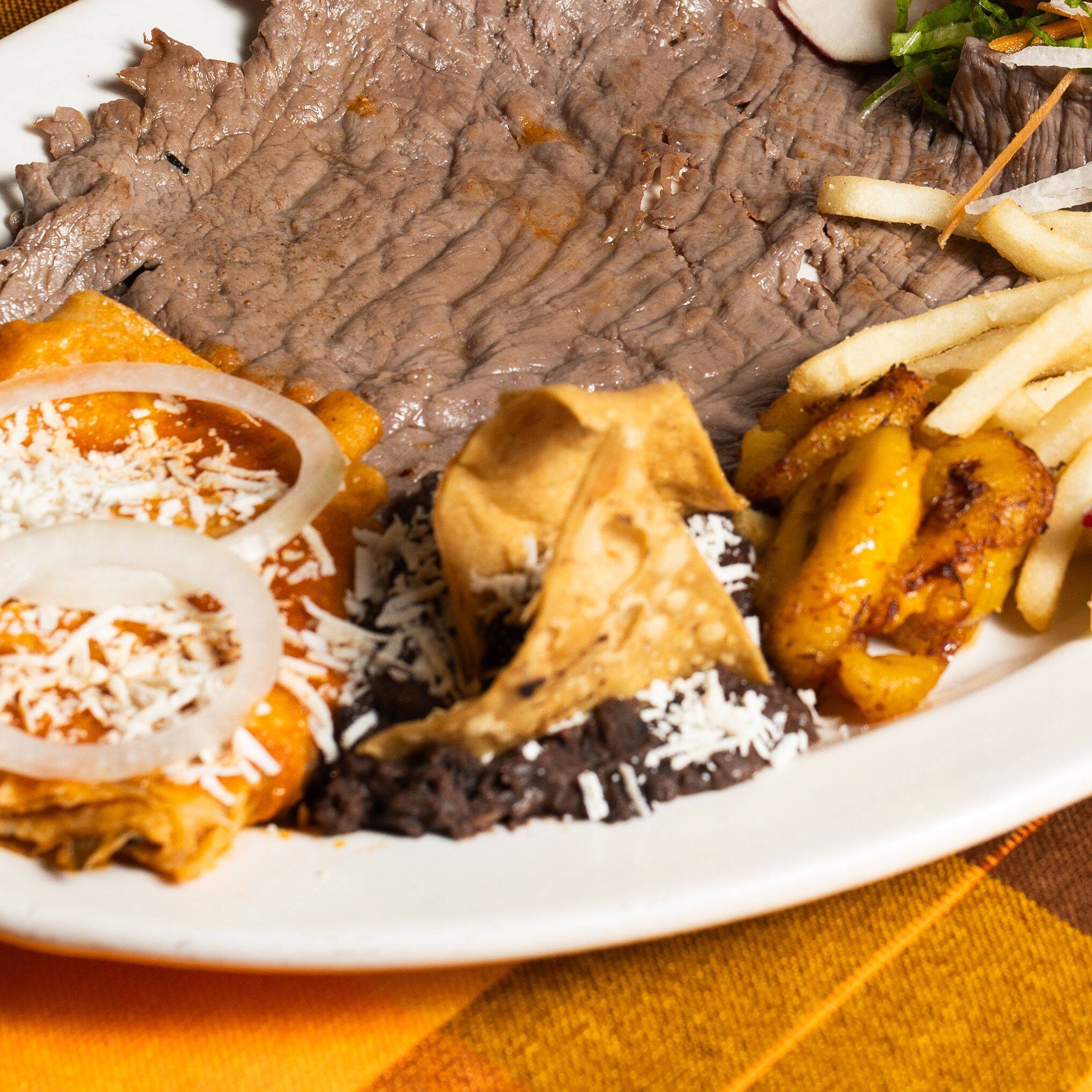 Cecina fresca , papas a las francesa plátanos fritos 2 enchiladas, frijoles refritos y ensalada