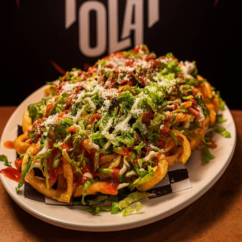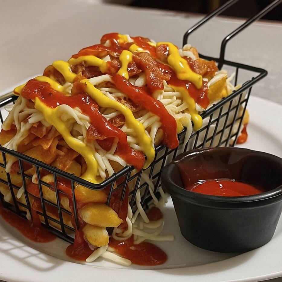 Orden de papas a la francesa preparadas con mayonesa, tocino, queso de hebra, mostaza y catsup.