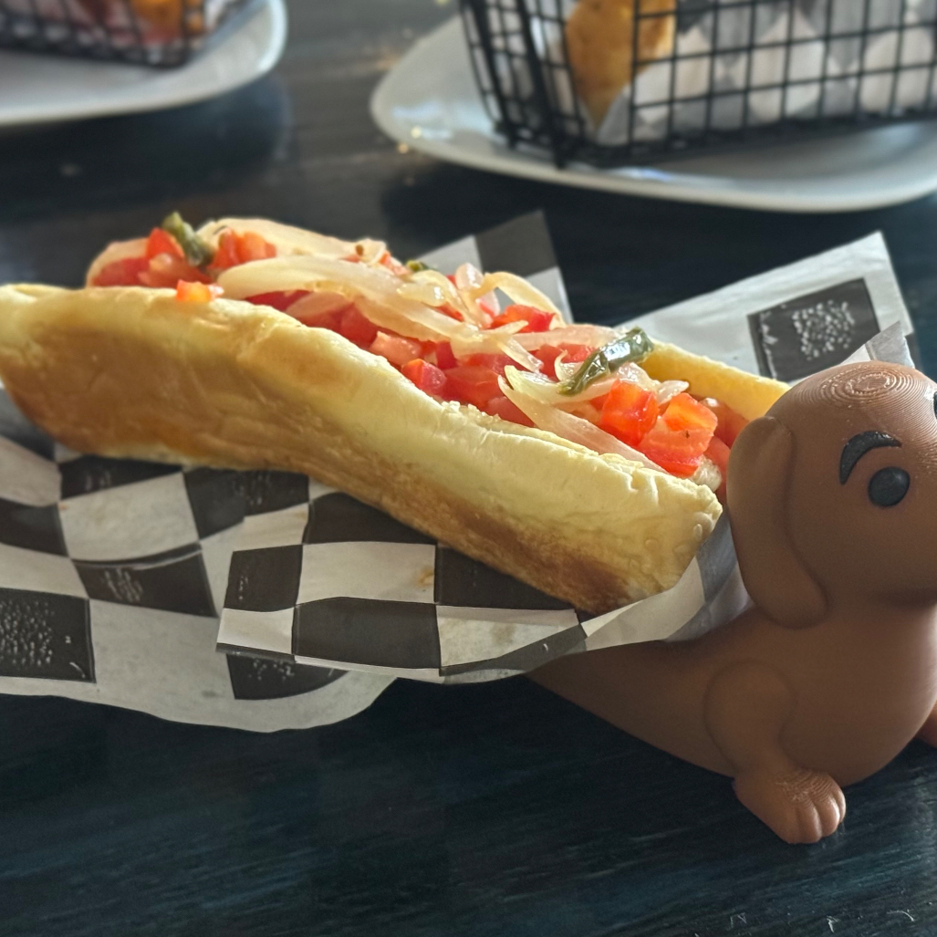 Hot-Dog jumbo preparado a la plancha con tomate, cebolla, rajas picantes mayonesa, mostaza, catsup