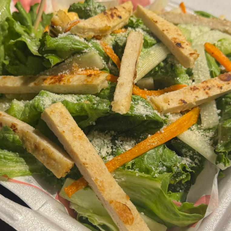 Mix de lechugas, acompañadas de frescas laminas de pepino y crujientes zanahorias salteadas en mantequilla, espolvoreadas de queso parmesano y tiras de pollo asado