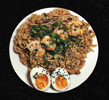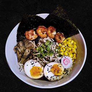 Camarones salteados, huevo marinado, naruto, alga nori, champiñones, cebollín, ajonjolí negro, grano de elote.