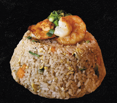 Arroz frito con salsa de soya, camarón, huevo, calabacita, zanahoria y cebollín.