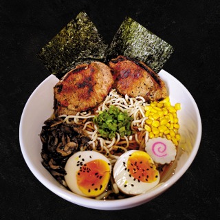 Carne de cerdo marinado, huevo marinado, grano de elote, naruto, champiñones, alga nori, cebollín y ajonjolí negro.
