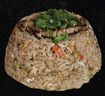 Arroz frito con salsa de soya, cerdo marinado, huevo, calabacita, zanahoria y cebollín.