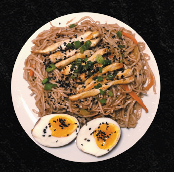 Tallarines fritos en salsa agridulce con pollo, huevo marinado, zanahoria y espolvoreado con ajonjolí negro.