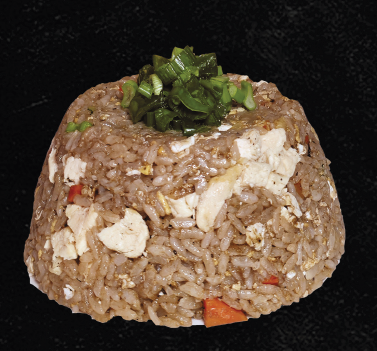 Arroz frito con salsa de soya, pollo, huevo, calabacita, zanahoria y cebollín.