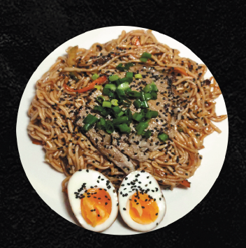 Tallarines fritos en salsa agridulce con cerdo marinado, huevo marinado, zanahoria y espolvoreado con ajonjolí negro.