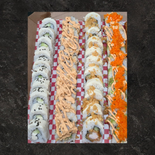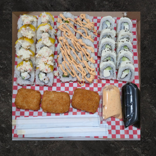 California, Jungla, Salmón especial, Mar y tierra y Chicken roll con una orden de tempura de camarón y una orden de kushiages de queso mini (El consumo de pescado crudo es responsabilidad de quien lo consume)