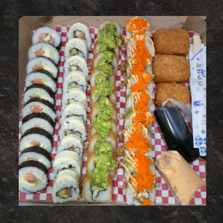 Salmón roll, Chicken especial, Mar y tierra y Veggie con una orden de kushiages de queso mini (El consumo de pescado crudo es responsabilidad de quien lo consume)