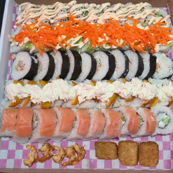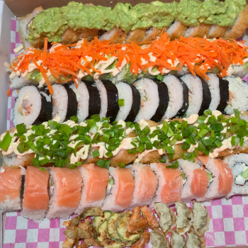 Ebi roll, Chicken roll, Philadelphia y California ebi con una orden de tempura de verdura