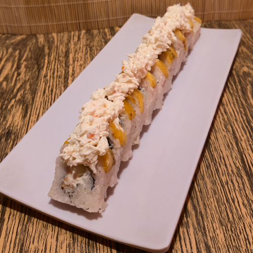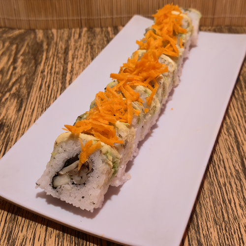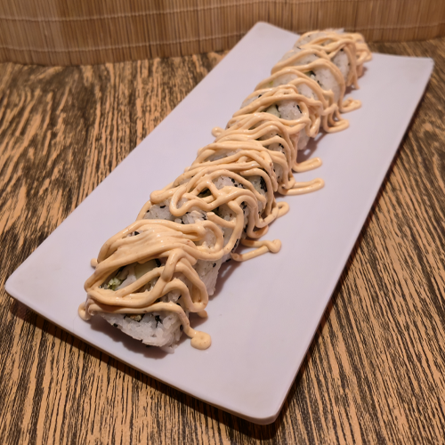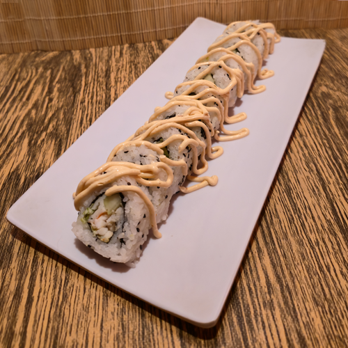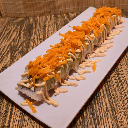 Queso crema, pepino, pollo empanizado, cubierta de aguacate con aderezo de chipotle y zanahoria rallada.