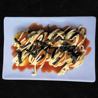 8 Bolitas de masa rellenas de col y pulpo, cubiertas con mayonesa, salsa de okonomiyaki y alga nori