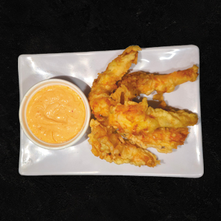 5 piezas de camarón con capeado crujiente, acompañadas de aderezo de chipotle