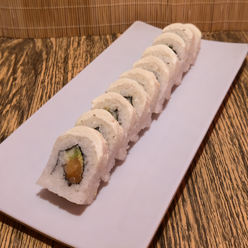 Pepino, queso crema, surimi, cubierta de láminas de salmón.