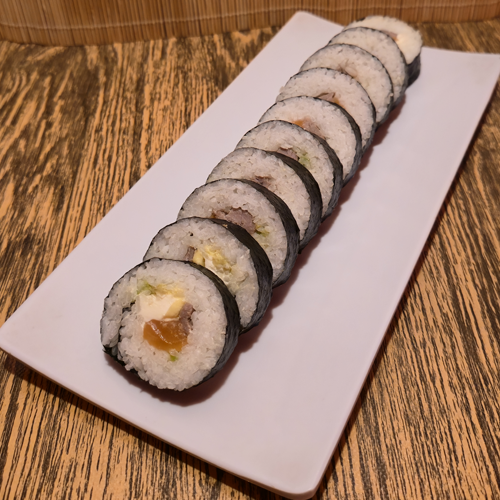 Salmón, queso crema, aguacate, arrachera, alga por fuera con aderezo chipotle.