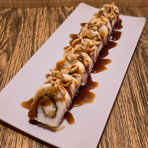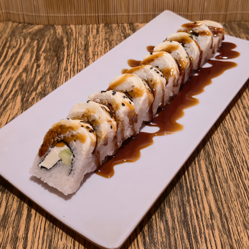 Camarón empanizado, aguacate, pepino, cubierta de queso crema con salsa de anguila.