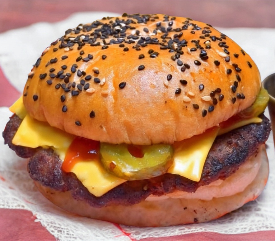Pan brioche, 130g. de carne de res sazonada, doble queso americano, pepinillos y condimentos.