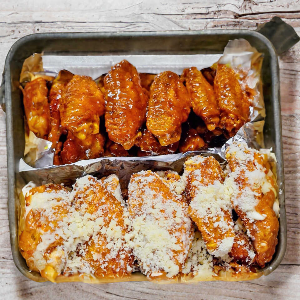30 piezas de alitas, 3 sabores a elegir, aderezo y vegetales.