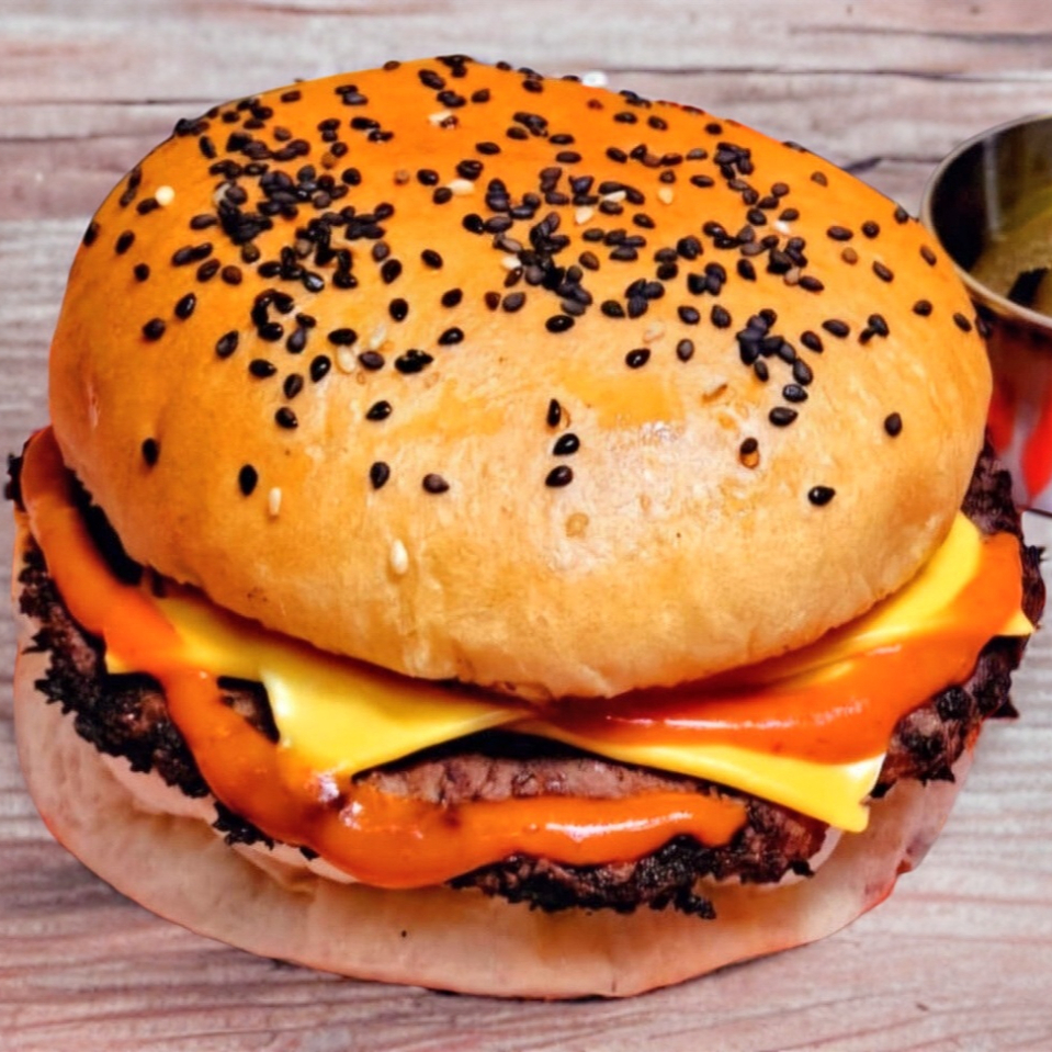 Auténtico pan brioche, boneless búfalo, doble queso americano, queso manchego, vegetales y condimentos.
