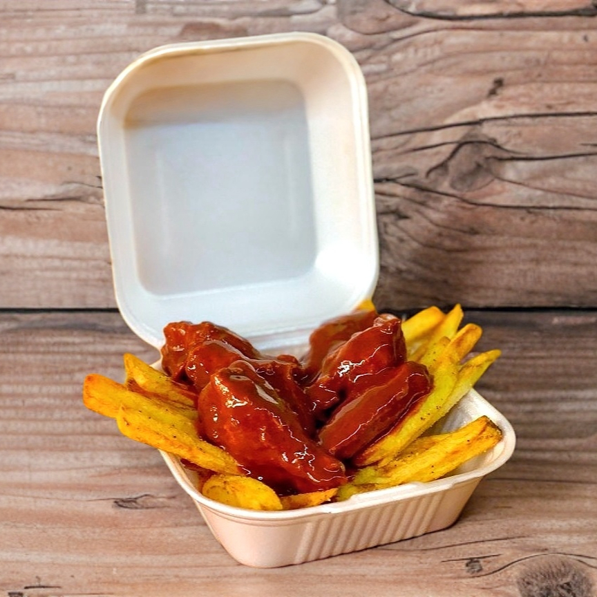 6 piezas de alitas sazonadas en tu salsa favorita, sobre papas a la francesa naturales + aderezo tipo ranch y catsup.