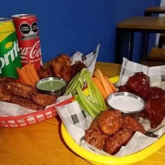 15 piezas de alitas con 3 sabores a elegir, incluye aderezo y zanahoria.
