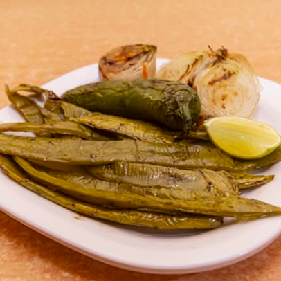 2 Nopales, 2 chiles toreados y 2 cebollitas asadas, todo asado directo al carbón.