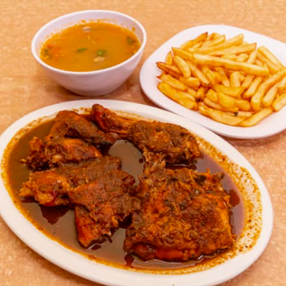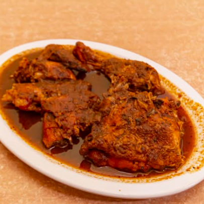1/2 Pollo tradicional de la cocina mexicana, servido en una abundante salsa picante, 4 piezas acompañadas con arroz y tortillas.