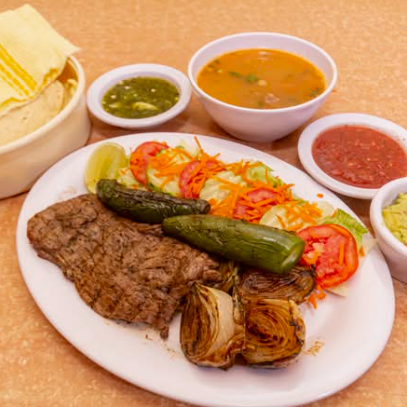 4 Personas: 1 kg de arrachera (peso en crudo), tortillas, 2 órdenes de frijoles charros, guacamole, ensalada, cebollinas y chiles toreados. Nota: se pesa cruda.