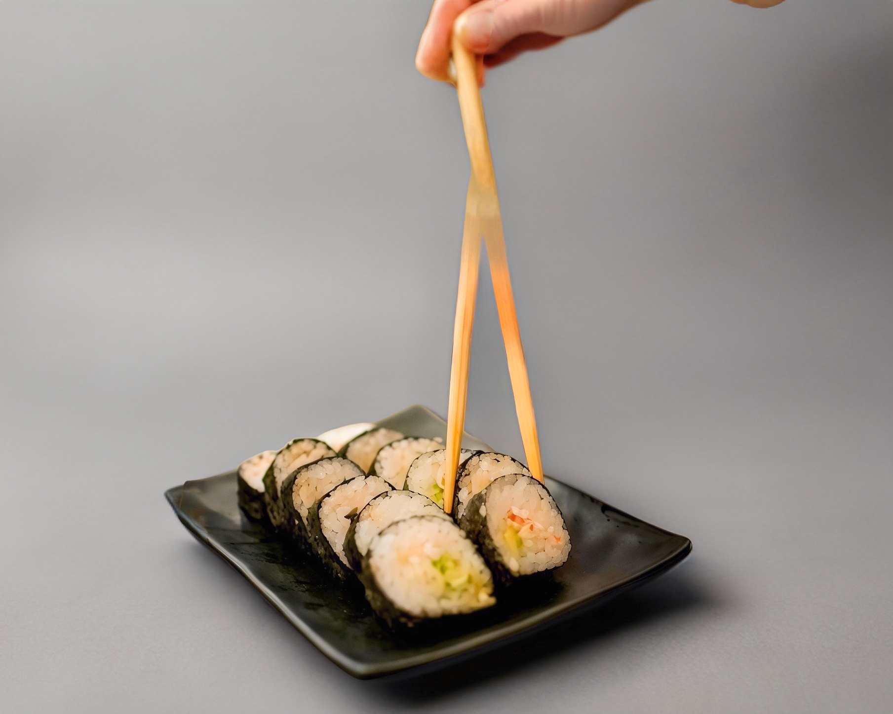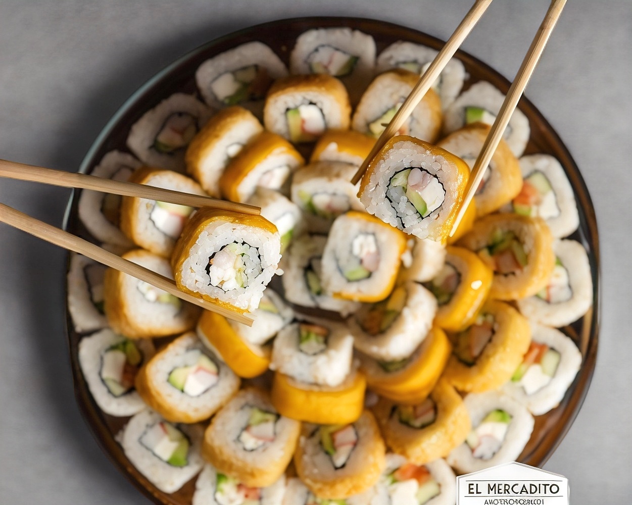100 Rollitos de sushi variado (camarón, salmón y surimi con queso philadelphia, aguacate y pepino, cubiertos de ajonjolí, plátano y empanizado) Incluye soya, chiles toreados o aderezo de chipotle.