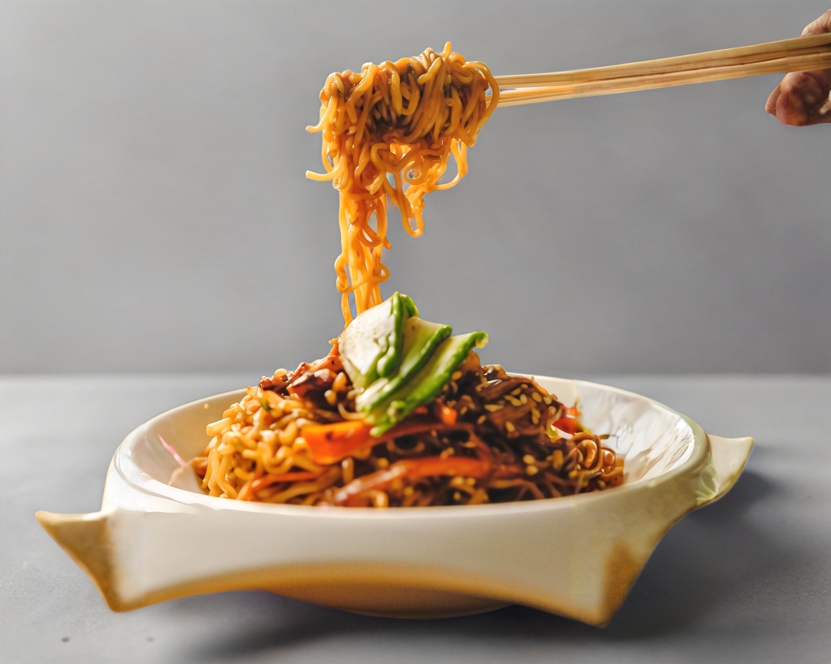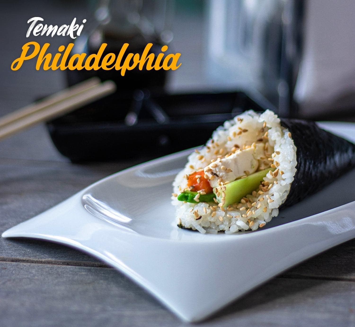 Pollo teriyaki, yakimeshi de verduras, pepino, queso philadelphia y aguacate.